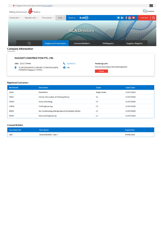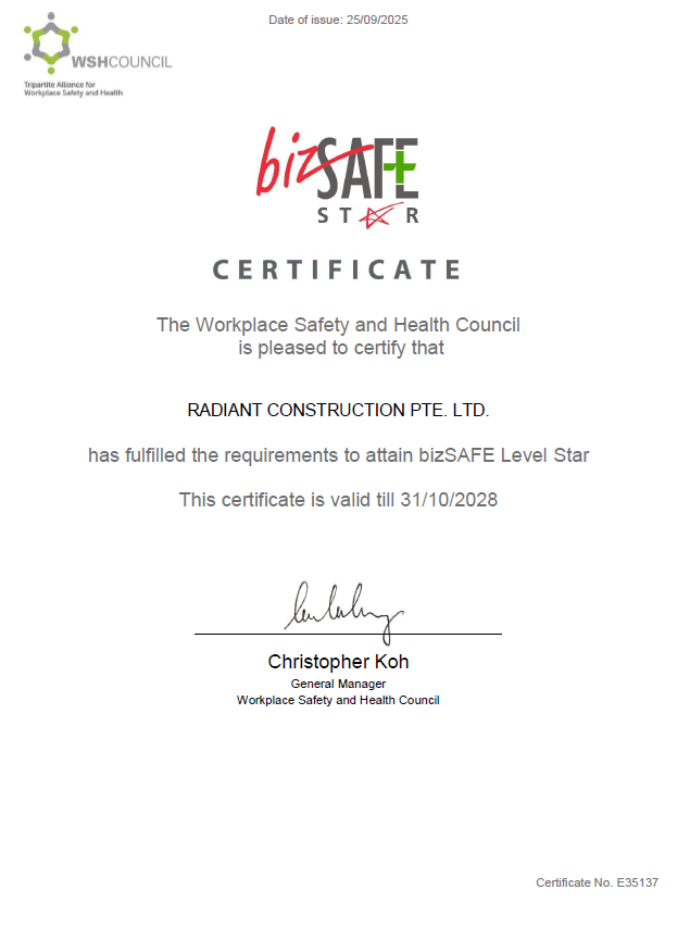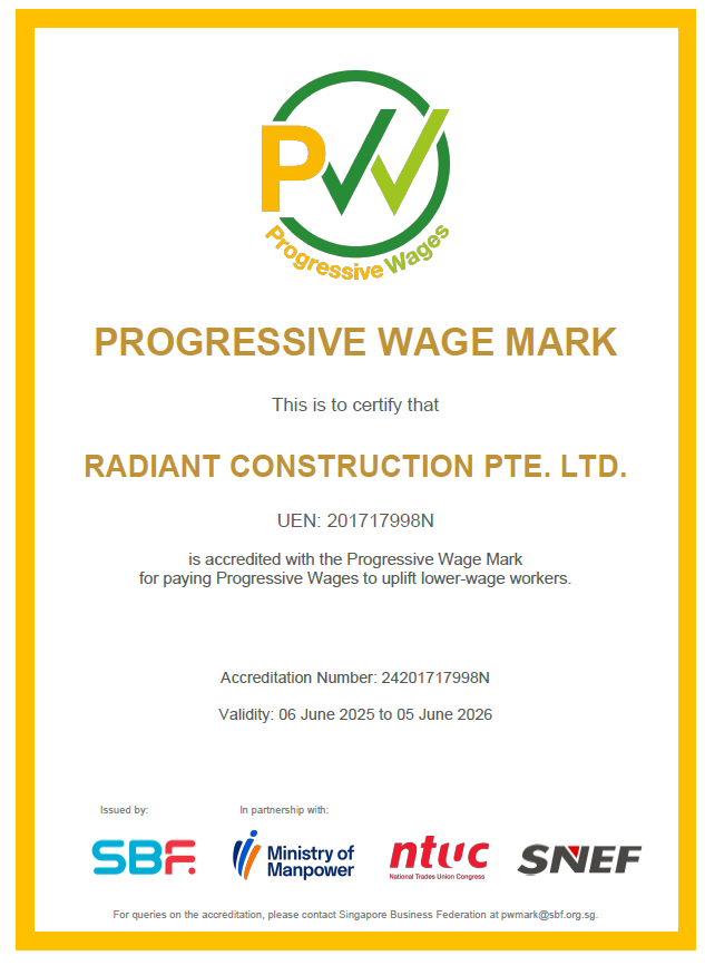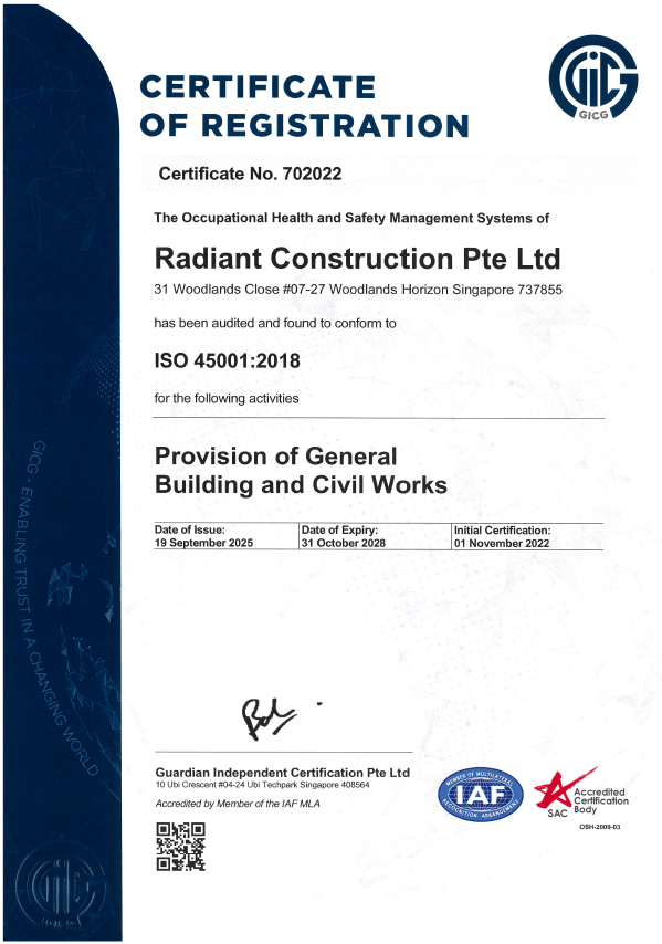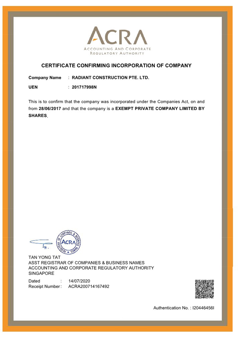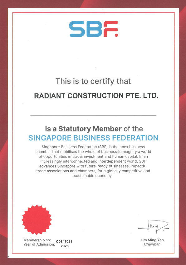 Excellence and Quality are the cornerstones that we endeavour in Radiant Construction Pte Ltd (RAD). We specialize in Building and Civil Construction and Engineering Solutions to Commercial, Industrial and Residential. Established in 2017, Radiant Construction Pte Ltd (RAD) is committed in providing Quality, Innovation and Sustainability in design and construction. We are registered contractor with Building and Construction Authority as General Builder Class 1 (General Builder under work head CW01 and Civil Engineering under work head CW02).